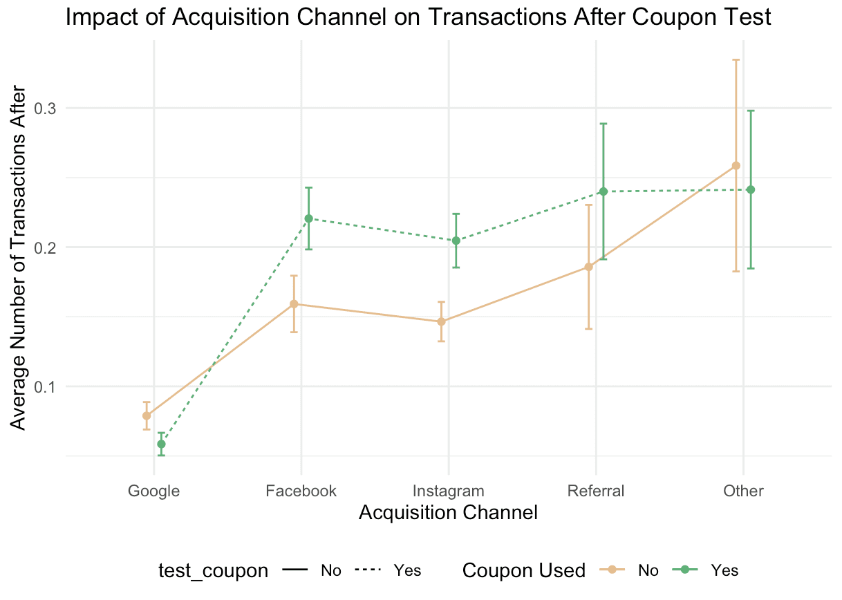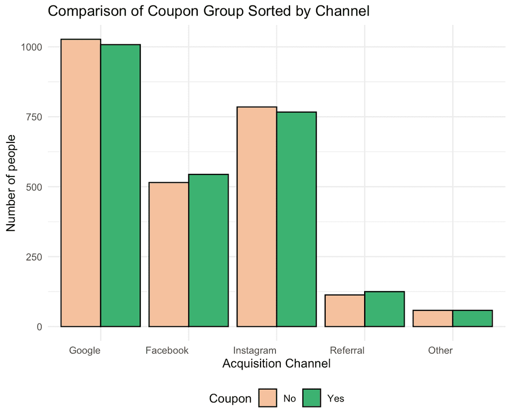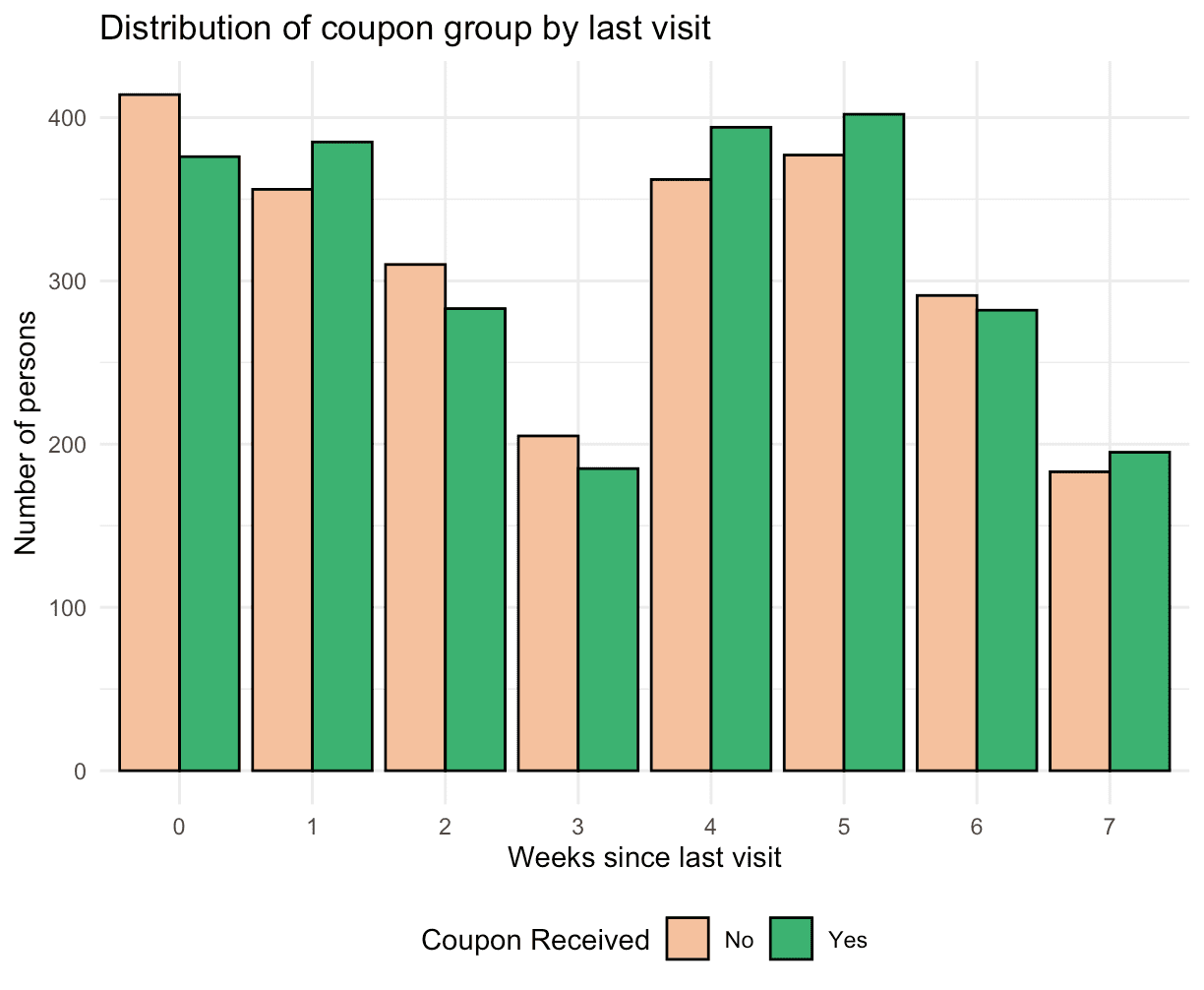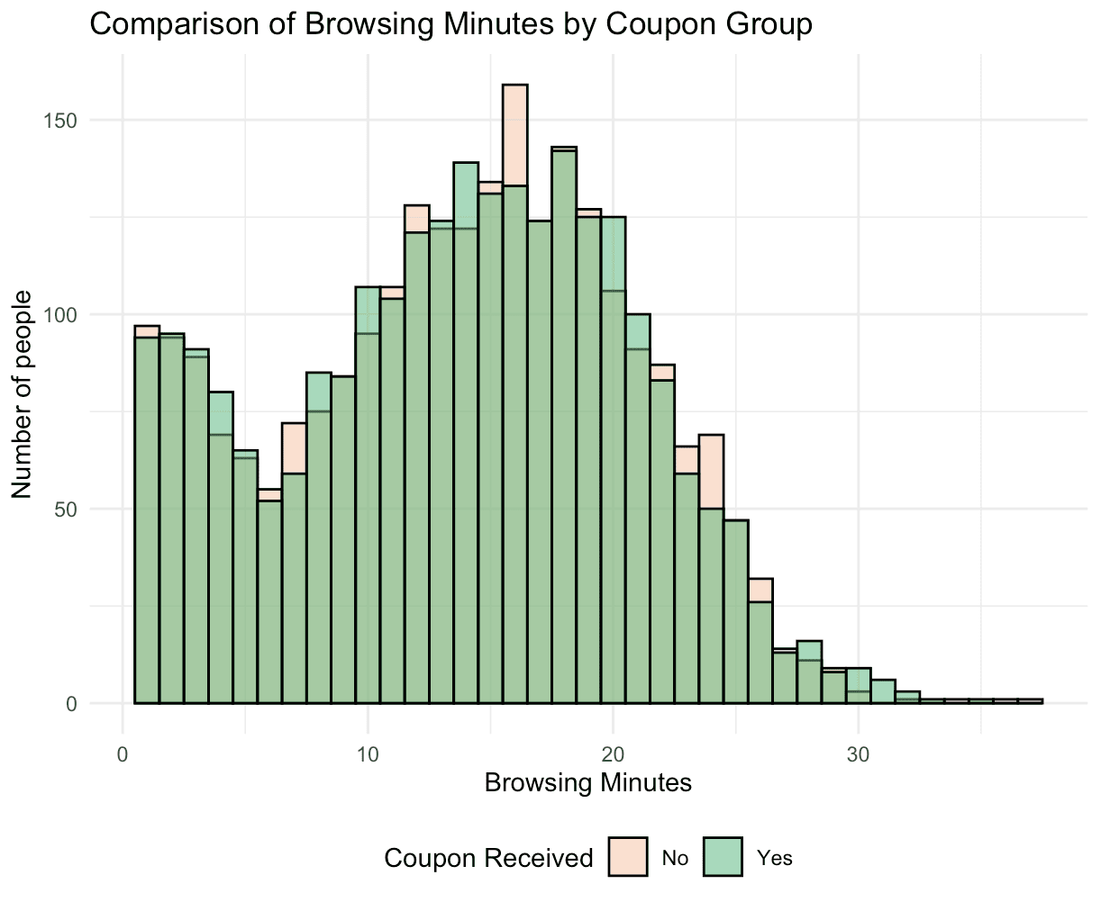 In assessing the randomness of the coupon assignment during the A/B test, we compared the test group (with coupon) and the control group (without coupon) across several variables: acquisition channel, browsing minutes, weeks since last visit, and the number of past purchases. The histograms and bar charts demonstrate an even distribution between the two groups for each variable.