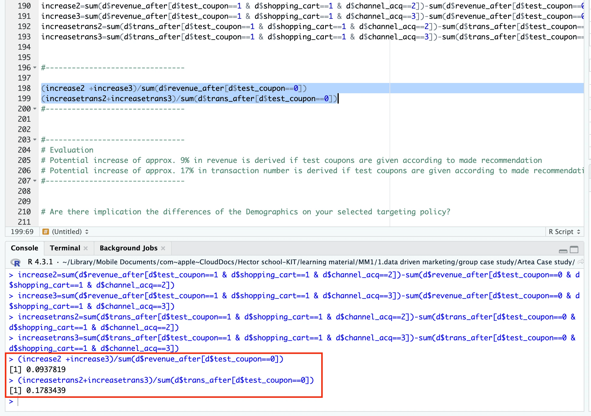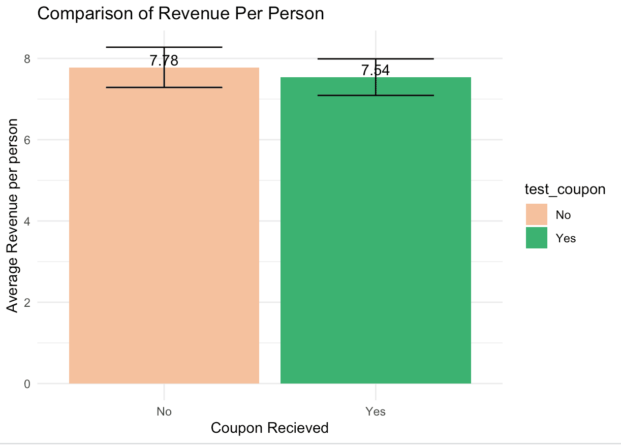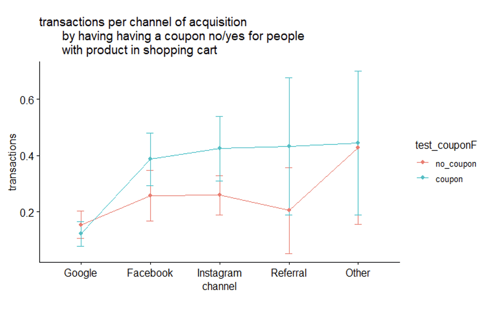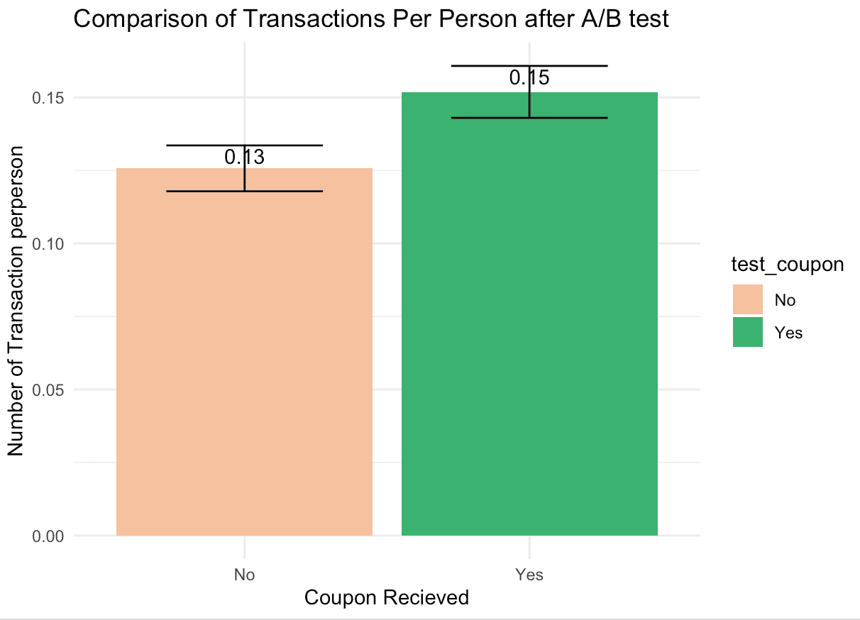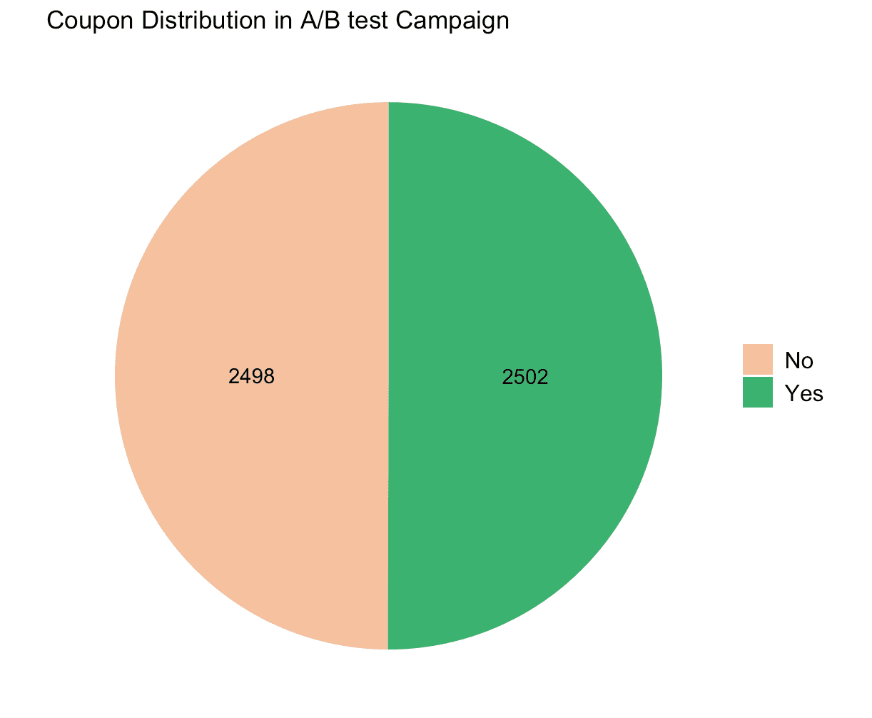 Artea, an online retailer known for its handmade clothing, experiences high visitor engagement but struggles with a low conversion rate: 87% of visitors do not purchase. To better understand customers and their purchase behaviour, the company ran an A/B test. The team randomly selected half of 5,000 users who had visited the website in the last 2 months but had not made a transaction, sent them a coupon that offered a 20% discount on the next purchase. The coupon was non-transferable to other users and was valid for one month. One month later, Artea marketing team collected the number of transactions and total expenditure made by all of the relevant users.