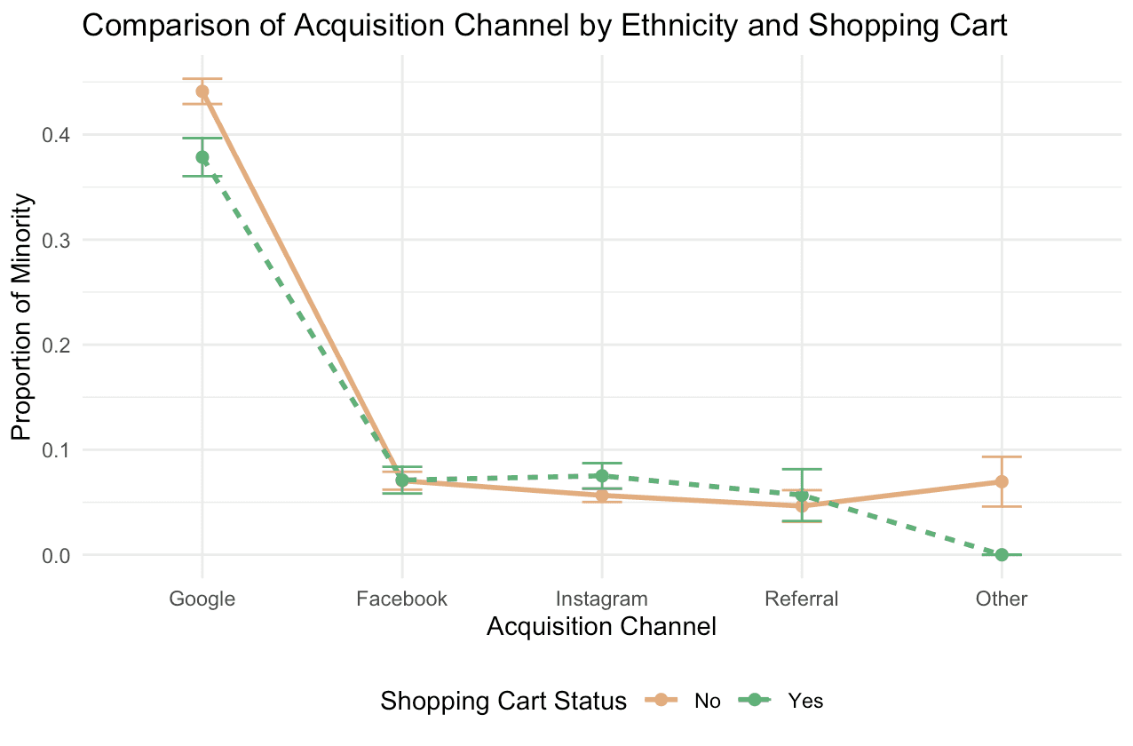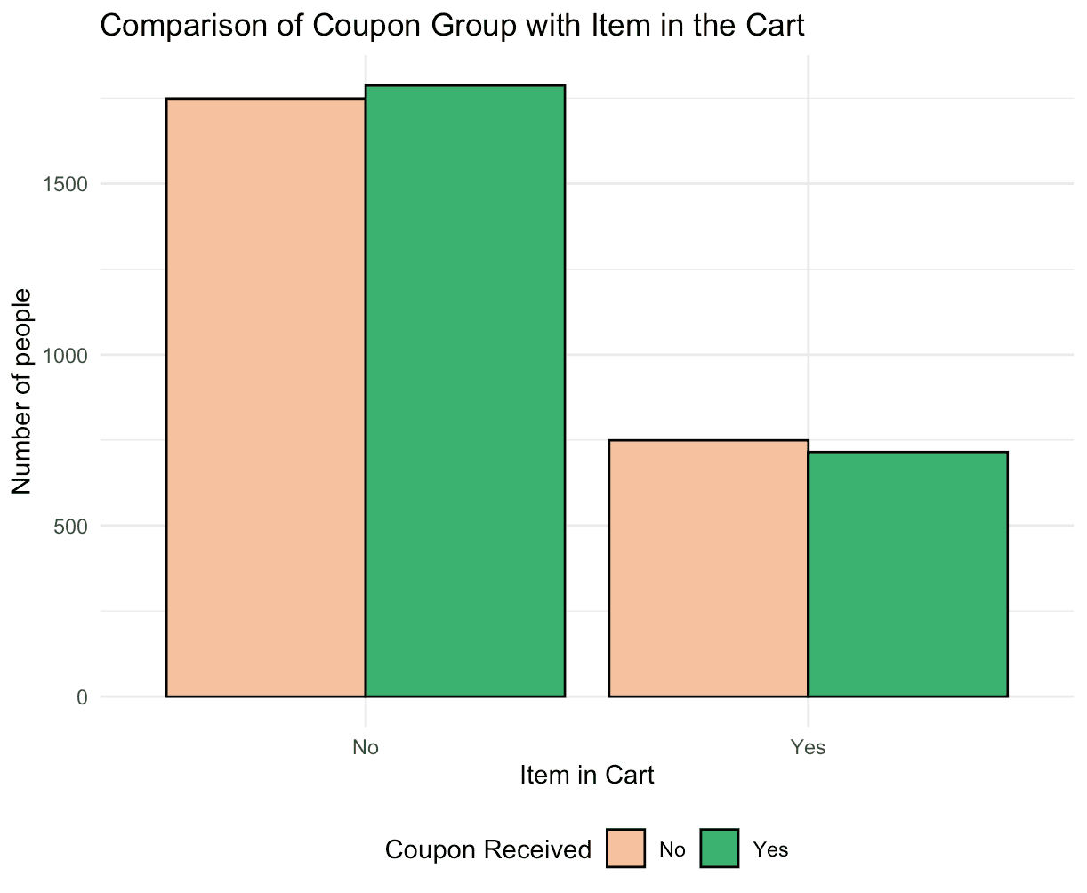 • Both minority and non-minority groups are equally likely to have items in their shopping cart. There is a similar level of engagement in terms of placing products into the cart between the two groups.