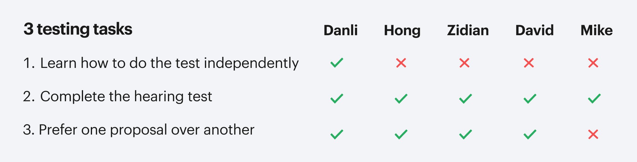 For our first round of user testing, we guided testing sessions with five colleagues from different department. Here's a brief overview of the process: