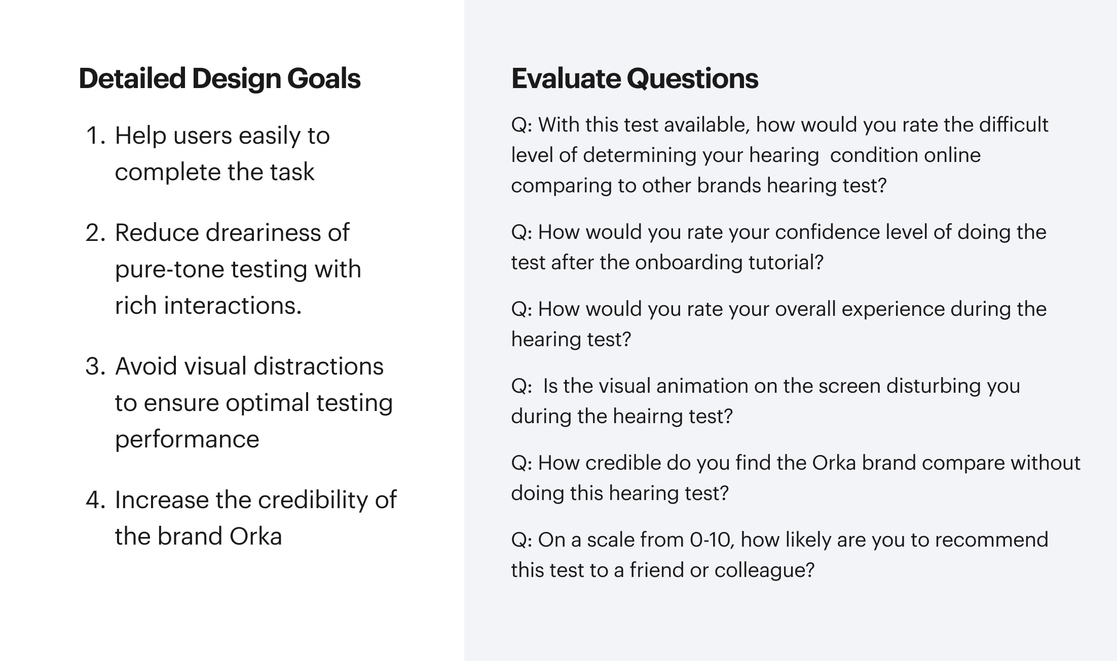 To understand how well the design worked, I split the big goals into smaller, specific targets and created a questionnaire to get clear answers.