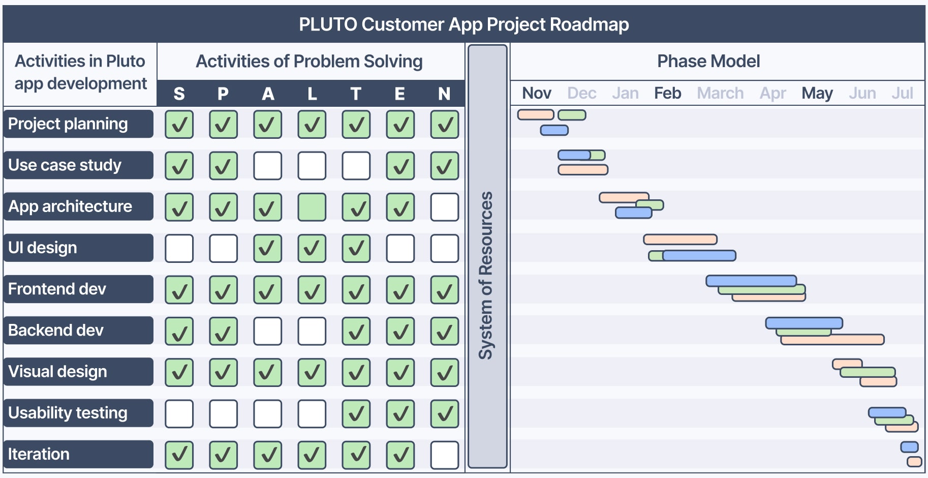 The key activities in this app development project are outlined below. For each activity, I utilised the problem-solving tool SPALTEN, which is similar to Design Thinking and Systems Thinking.